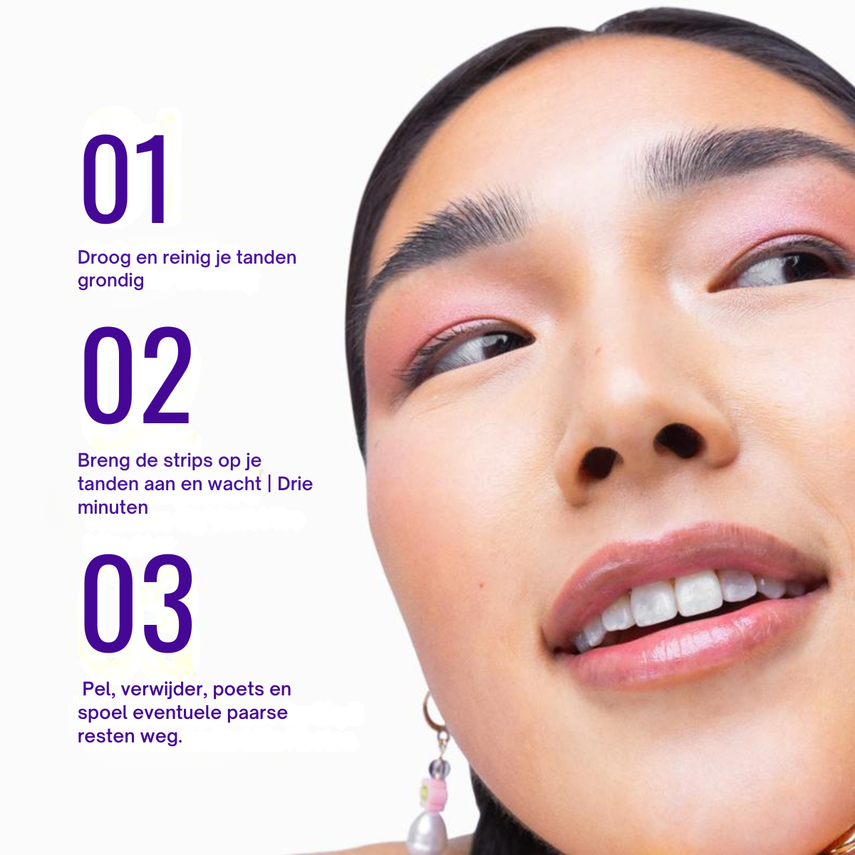 Onze strips bevatten paarse pigmenten die de kleur corrigeren en het geel direct bij contact neutraliseren, terwijl zachte en tandglazuur-veilige ingrediënten werken zonder peroxide.